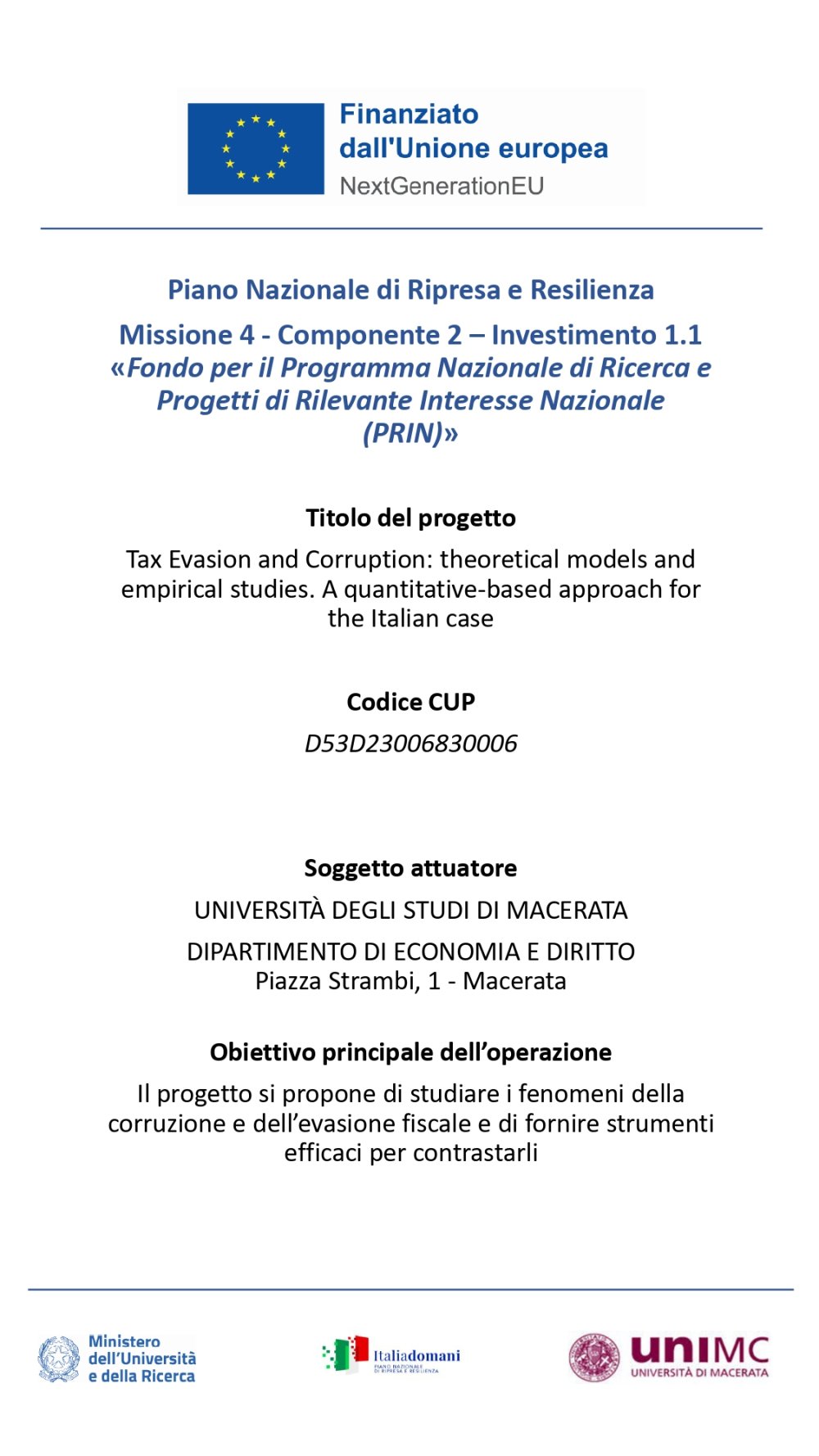 Il Convegno Finale del progetto “TEC - Tax Evasion and Corruption: theoretical models and empirical studies. A quantitative-based approach for the Italian case”, si terrà presso l’Università degli Studi di Macerata, Dipartimento di Economia e Diritto, il 27 gennaio 2026. L'evento è volto a presentare i risultati ottenuti nell’ambito del progetto finanziato, raccolti in un volume edito dalla casa editrice Springer, e sarà seguìto da una tavola rotonda alla presenza di rappresentanti di enti e istituzioni (lista degli ospiti in fase di definizione).